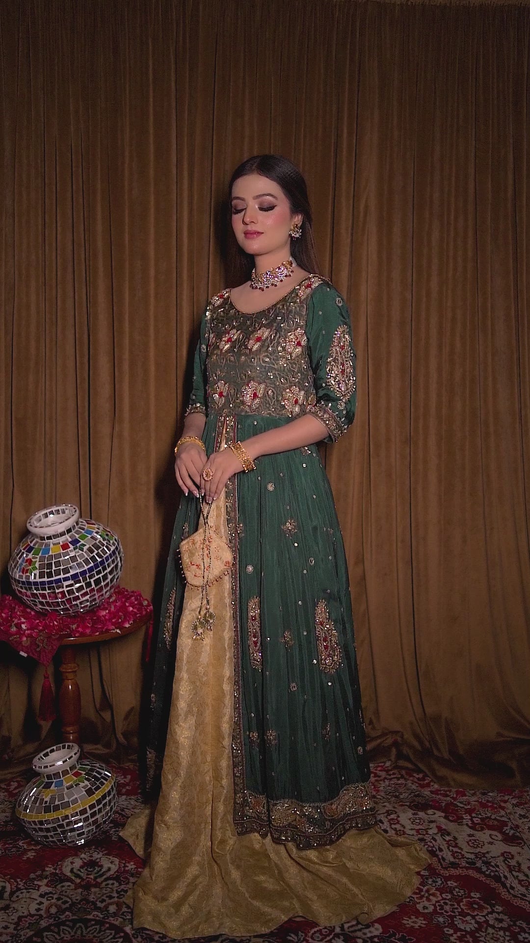 This front-open silhouette is intended to accentuate the wearer's elegance and grace. It has a fitted bodice and a separate gown with a flattering waistline that gradually widens out into a voluminous lehenga that lends a sense of opulence to the ensemble. This pair of bottle green studded pishwas with a lehenga is ideal for any special occasion where you want to make a lasting impact.