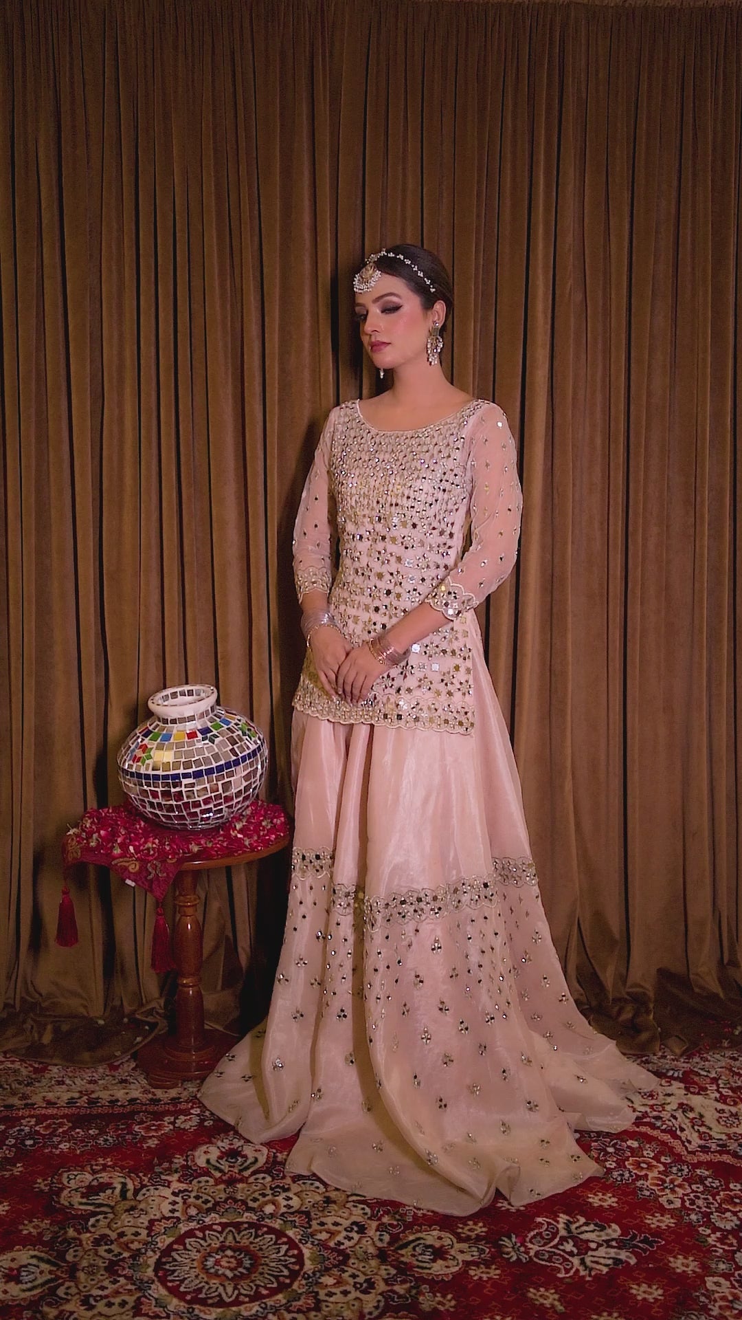 SHEESH MAHAL is a classic majestic look, well suited for formal occasions. This beautiful light peach shirt is adorned with reverie like embellishments, rendered in a glowing tilla and sheesha work. Paired with gorgeously accented flowy organza sharara with motif spray and adorned borders. The elegant look is completed with an organza dupatta, adding details of kiran lace, to make it an ideal festive wear.